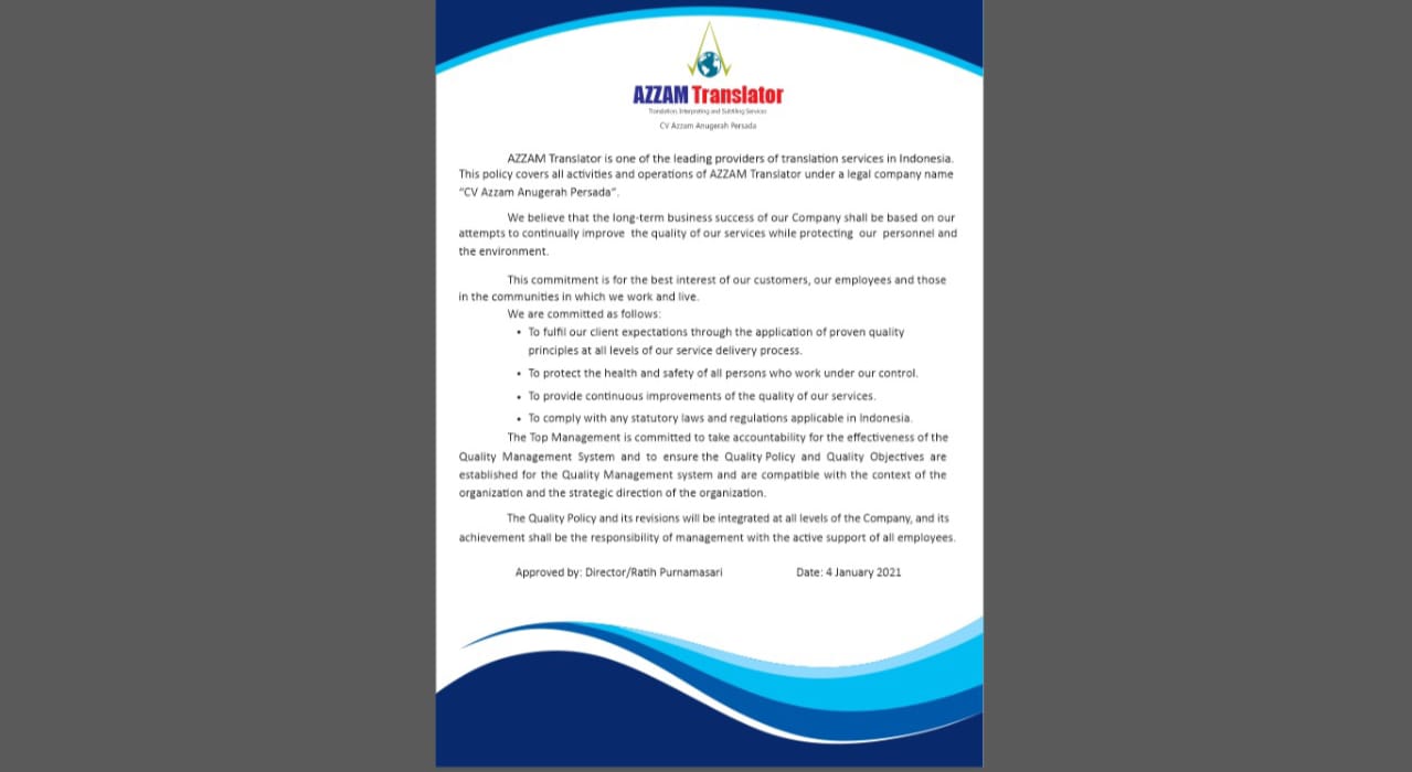 The strong idealism and spirit at Azzam Translator drives us to continue to improve our company performance through innovation and increasing the quality of our services. In addition to language mastery, good-mannered personalities are a defining characteristic of Azzam Translator’s executives, staffs, translators, editors, and interpreters. This is why we continue to be trusted with confidential documents or information provided by the clients. read more.....